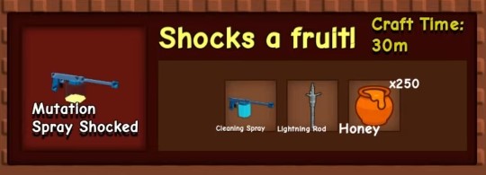 Once crafted, the Mutation Spray Shocked can be used on one fruit per application, making it an item to be used wisely on high-value crops to maximize its effect.